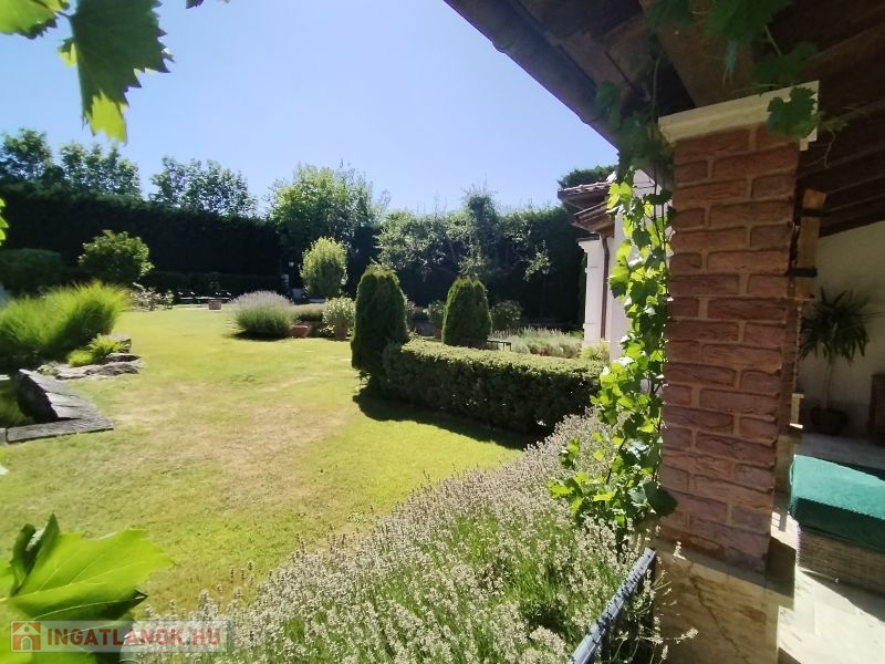 A házat körülölelő álomszép kertben kis pihenők, tavirózsás halastó, gyönyörű növényzet, mely nemcsak szemet gyönyörködtető, de maximális intimitást is biztosít az itt lakóknak.