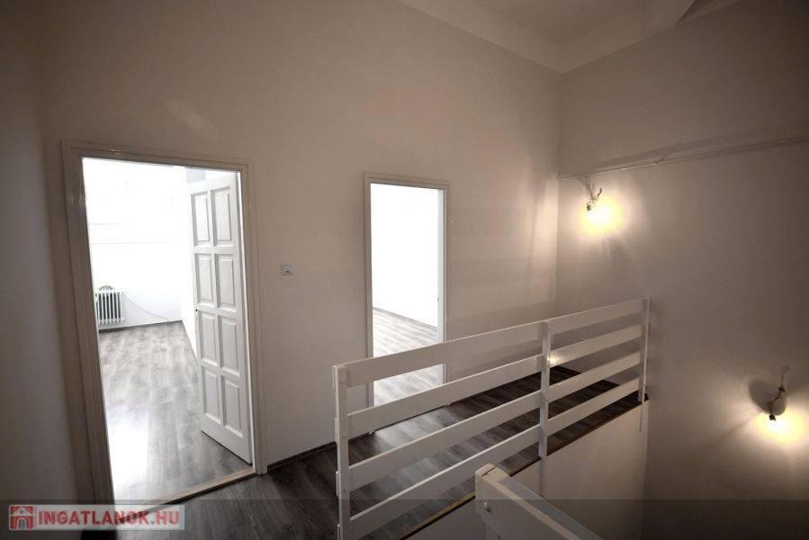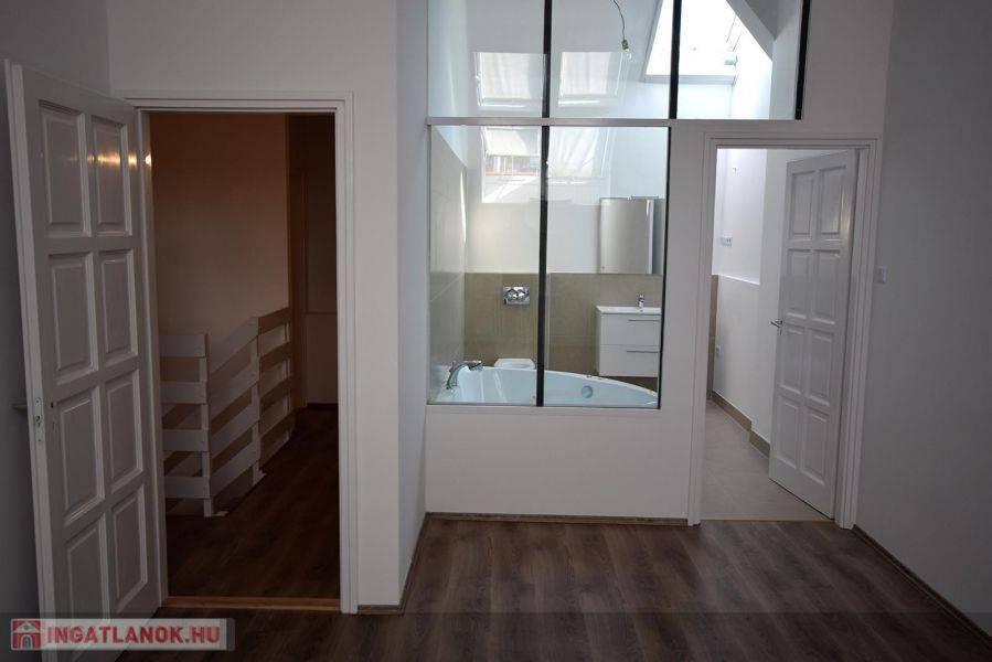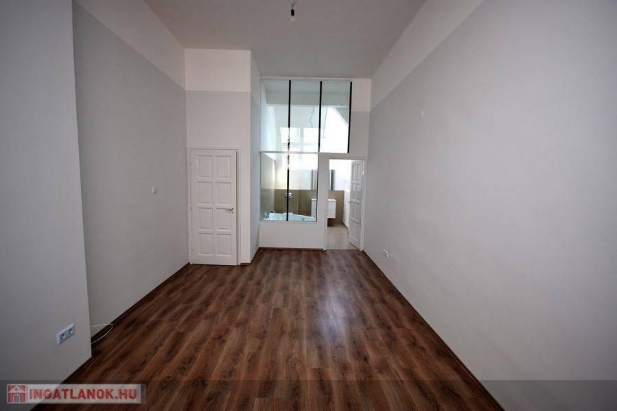 * lakás alsó szintje: nappali, konyha, étkező, 1 hálószoba, 1 fürdőszoba, külön wc, közlekedő, előszoba ( innen nyíló lépcső a felső szintre ); belmagasság: 4.00 m